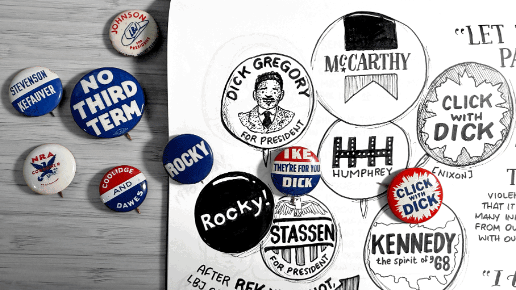 Below, I gathered my campaign button doodles* and my new treasures. Next time I stumble into a political memorabilia opportunity, I’ll know just which buttons to collect.