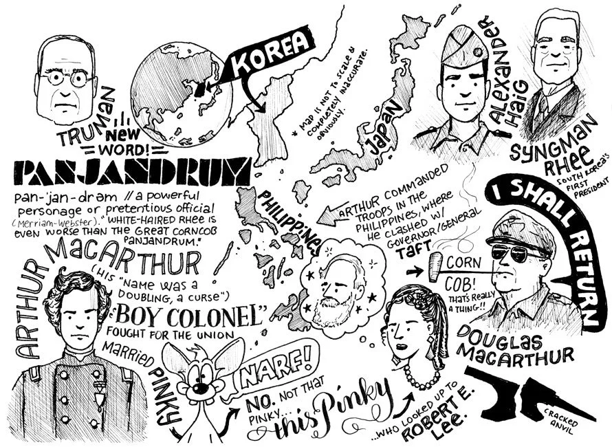 Douglas MacArthur was mentioned though; I remember that much. I’m using that as an opportunity to share a doodle of MacArthur and his parents. His dad was Arthur MacArthur and his mom was Pinky. Not the Pinky who looked up to Brain. This Pinky looked up to Robert E. Lee.