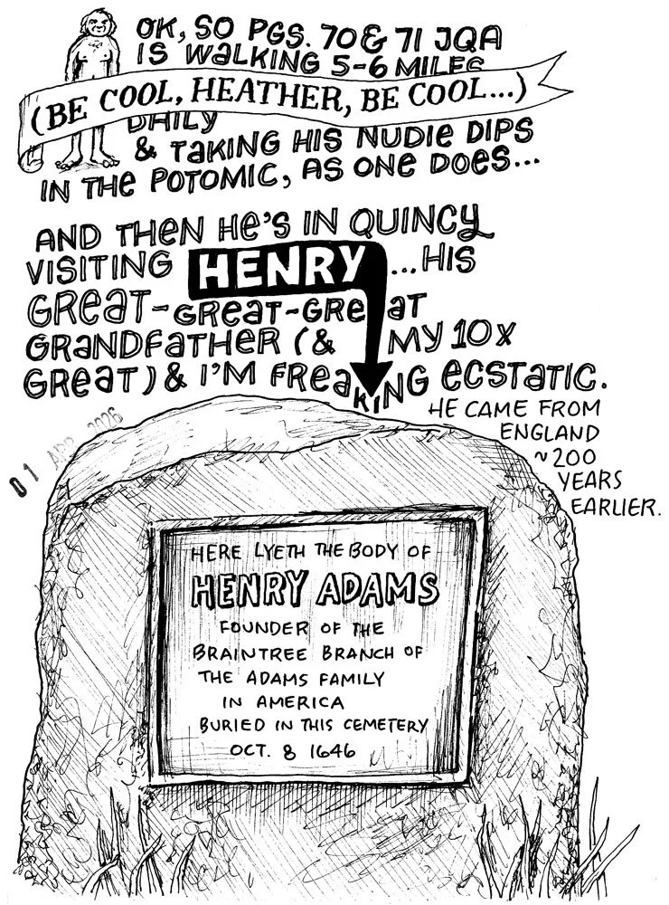 I just got to the part in Bob Crawford’s new book America’s Founding Son: John Quincy Adams, from President to Political Maverick where John Quincy Adams visits his sister Nabby’s grave in Quincy, Massachusetts and swings over to pay respects to his great-great-great-grandfather Henry Adams.