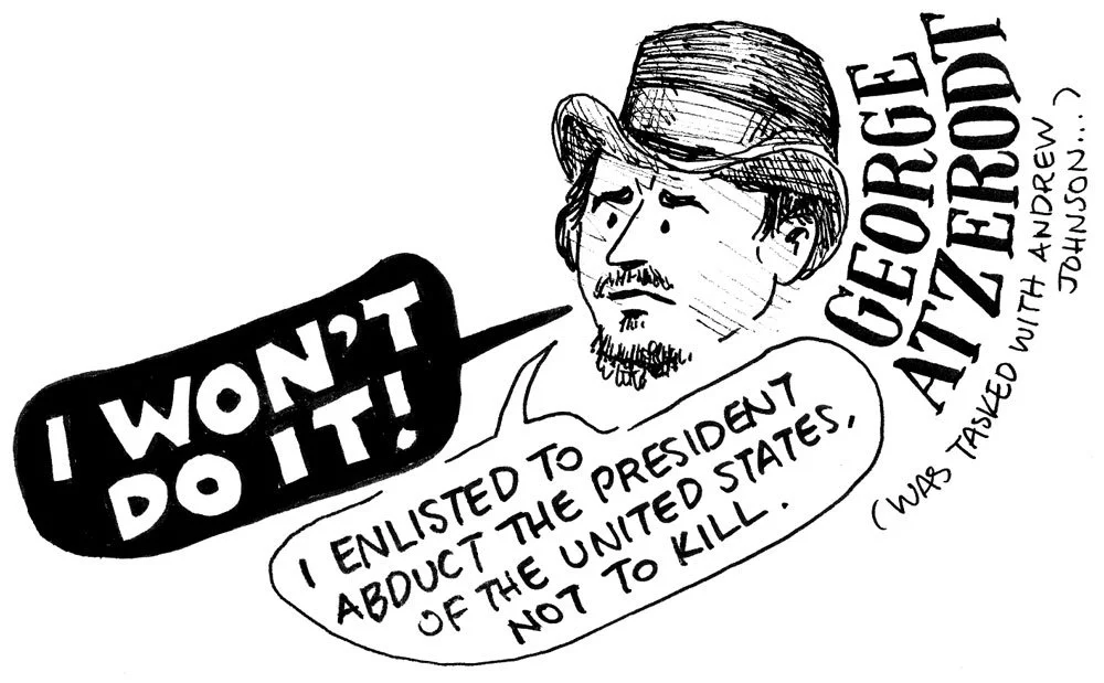 IRL Artzerodt backed out of the plan, which initially only involved abducting President Lincoln. Doodle inspired by Lincoln, by David Herbert Donald.