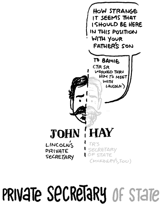 John Hay began his career as Abraham Lincoln’s private secretary and ended it as TR’s Secretary of State. Hay commented to Bamie “how strange it seems that I should be here in this position with your father’s son.” (Theodore Roosevelt, Sr. had worked through him to meet with Lincoln.)
