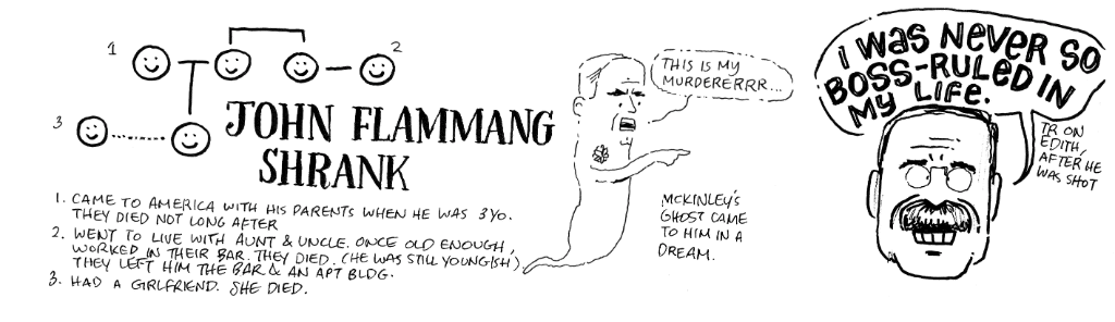John Flammang Shrank, the guy who tried to kill Roosevelt, was a 36-year-old Bavarian immigrant. I knew McKinley’s ghost came to him in a dream and that he considered himself McKinley’s “avenger”. I knew TR’s long speech and glasses case saved him and that he kept giving his speech.