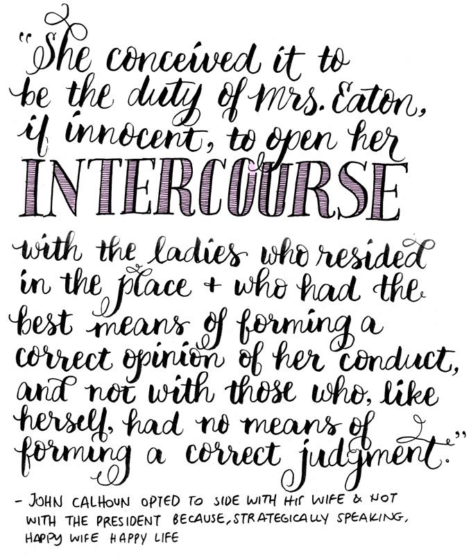 WTF is he talking about? He didn’t even care that much about Margaret Eaton and knew it was dangerous taking a stand against his boss, President Jackson. But, strategically speaking, happy wife happy life.