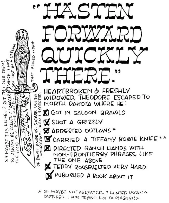 In North Dakota, he carried a Tiffany bowie knife and said non-frontiersy things like “hasten forward quickly there.”