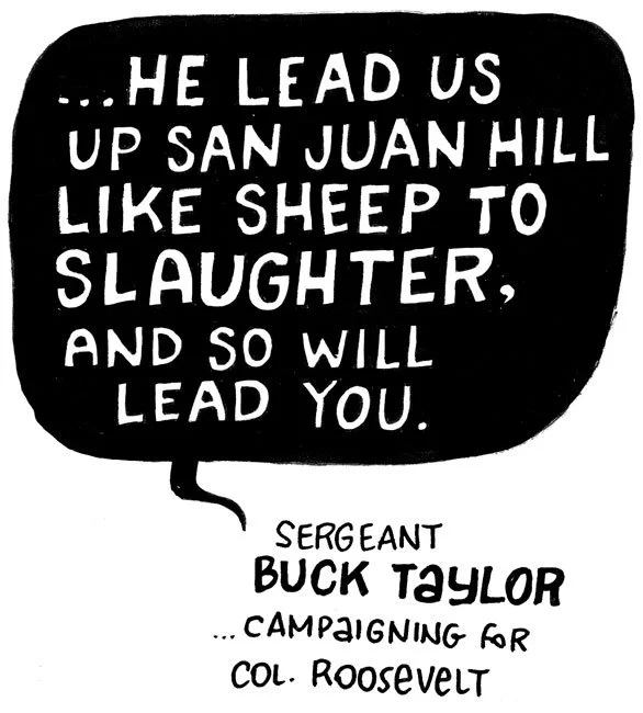 While campaigning for Colonel Roosevelt, Sergeant Buck Taylor declared that Roosevelt “lead us up San Juan Hill like sheep to slaughter, and so will lead you.”