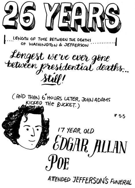 And sometime in between their two deaths, 17-year-old Edgar Allan Poe attended Thomas Jefferson’s funeral. The span between the deaths of Washington and Jefferson lasted 26 years. That’s still the longest we’ve ever gone between presidential deaths. Five and a half hours after Jefferson died, John Adams died… marking the shortest period of time between presidential deaths. None of that has anything to do with tuberculosis (at least I don’t think so, but they don’t really know how Jefferson died) but I couldn’t not mention it since it’s right there next to my doodle of Poe.