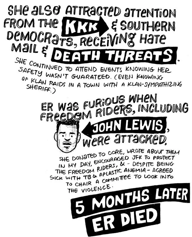 She was furious when Freedom Riders, including John Lewis, were attacked. She made financial donations, wrote about the Freedom Fighters in her My Day column, encouraged JFK to protect the Riders, and (despite being sick with tuberculosis and aplastic anemia), agreed to chair a committee to look into the violence.