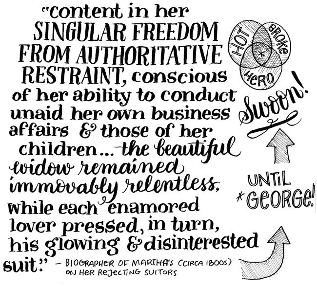 Martha was “content in her singular freedom from authoritative restraint.” She was the wealthiest woman in the colonies. The “beautiful widow remained immovably relentless” despite the interested suitors, according to an 1800s biographer. Until George came along. He was hot, broke, and a hero. What’s not to love!